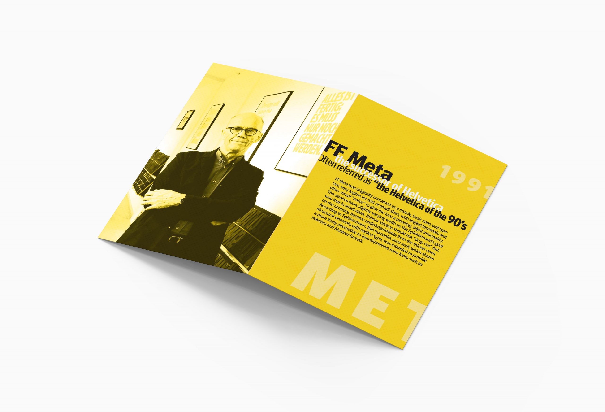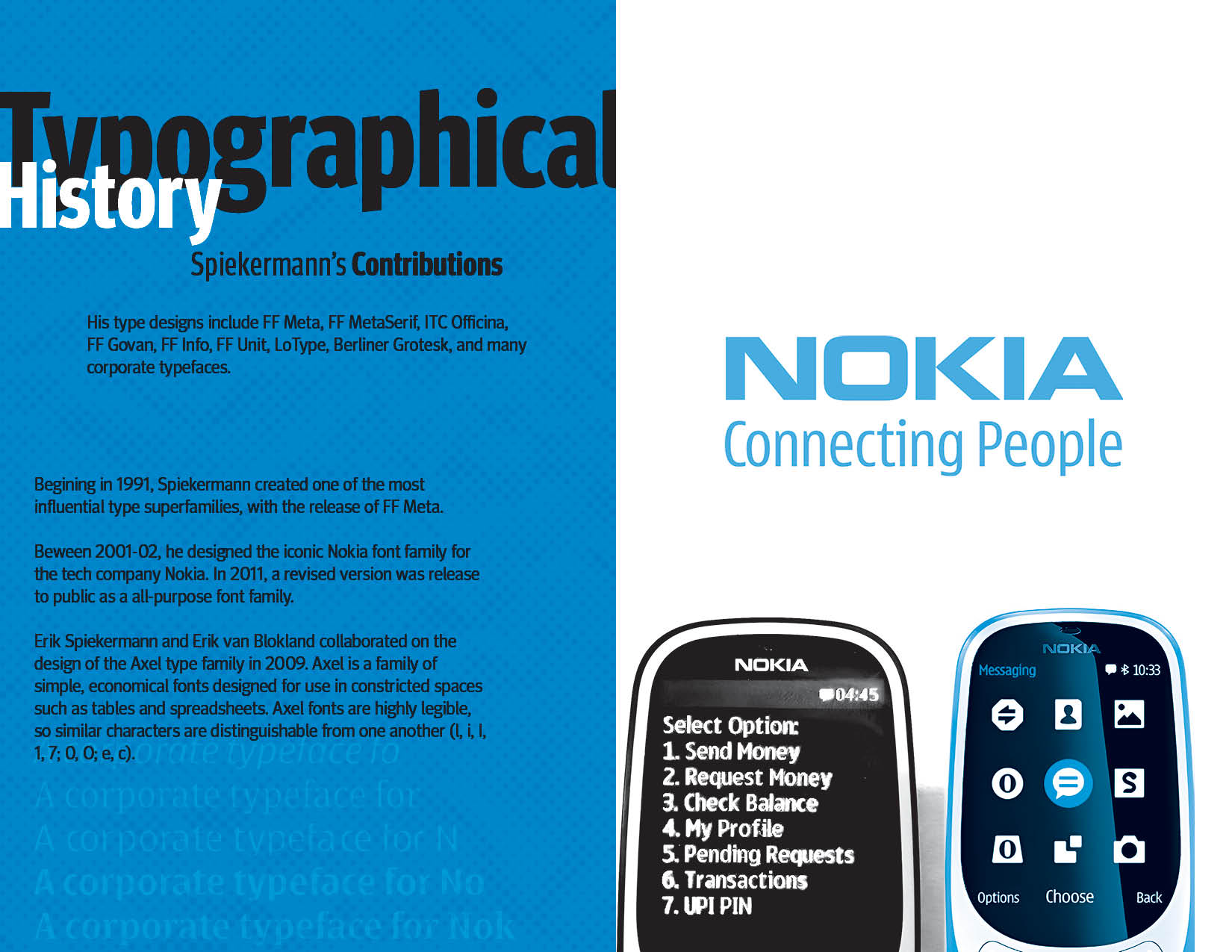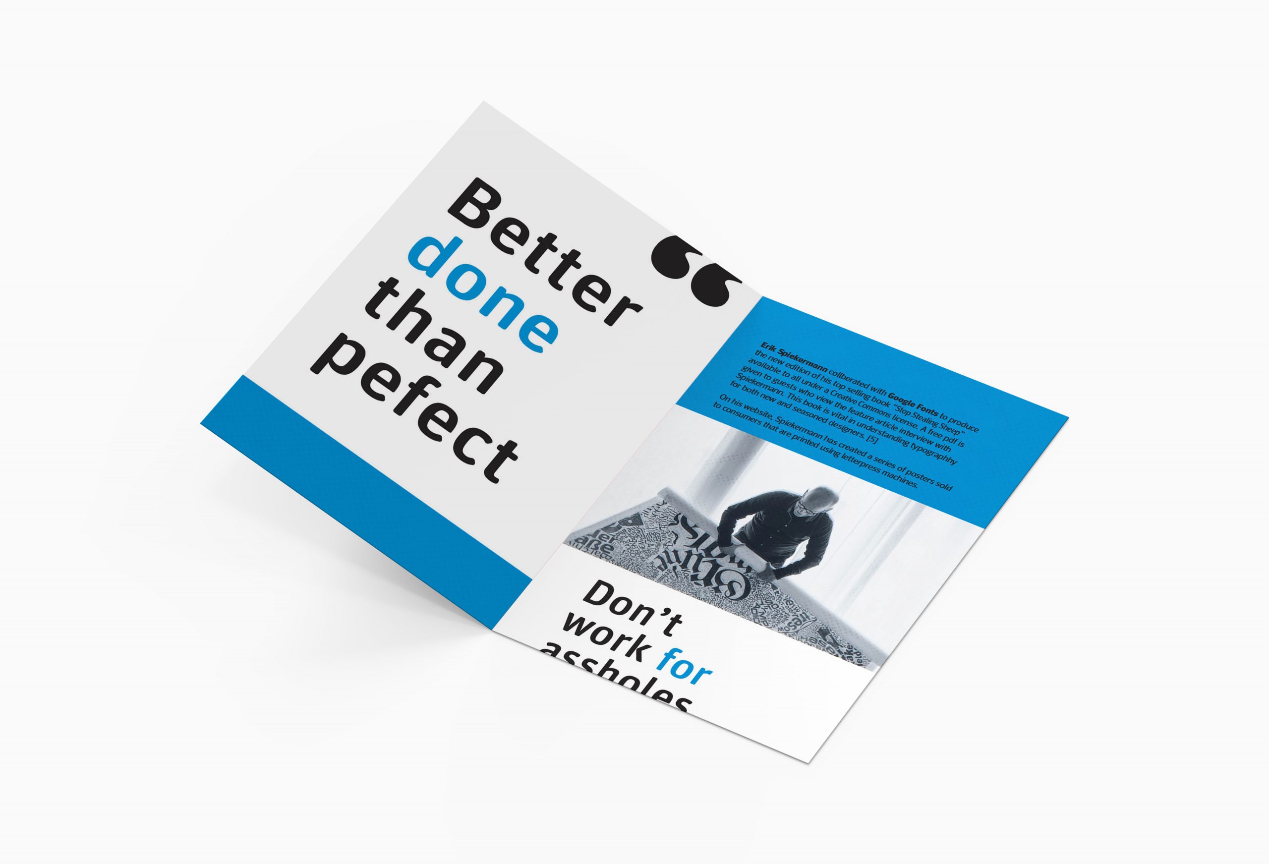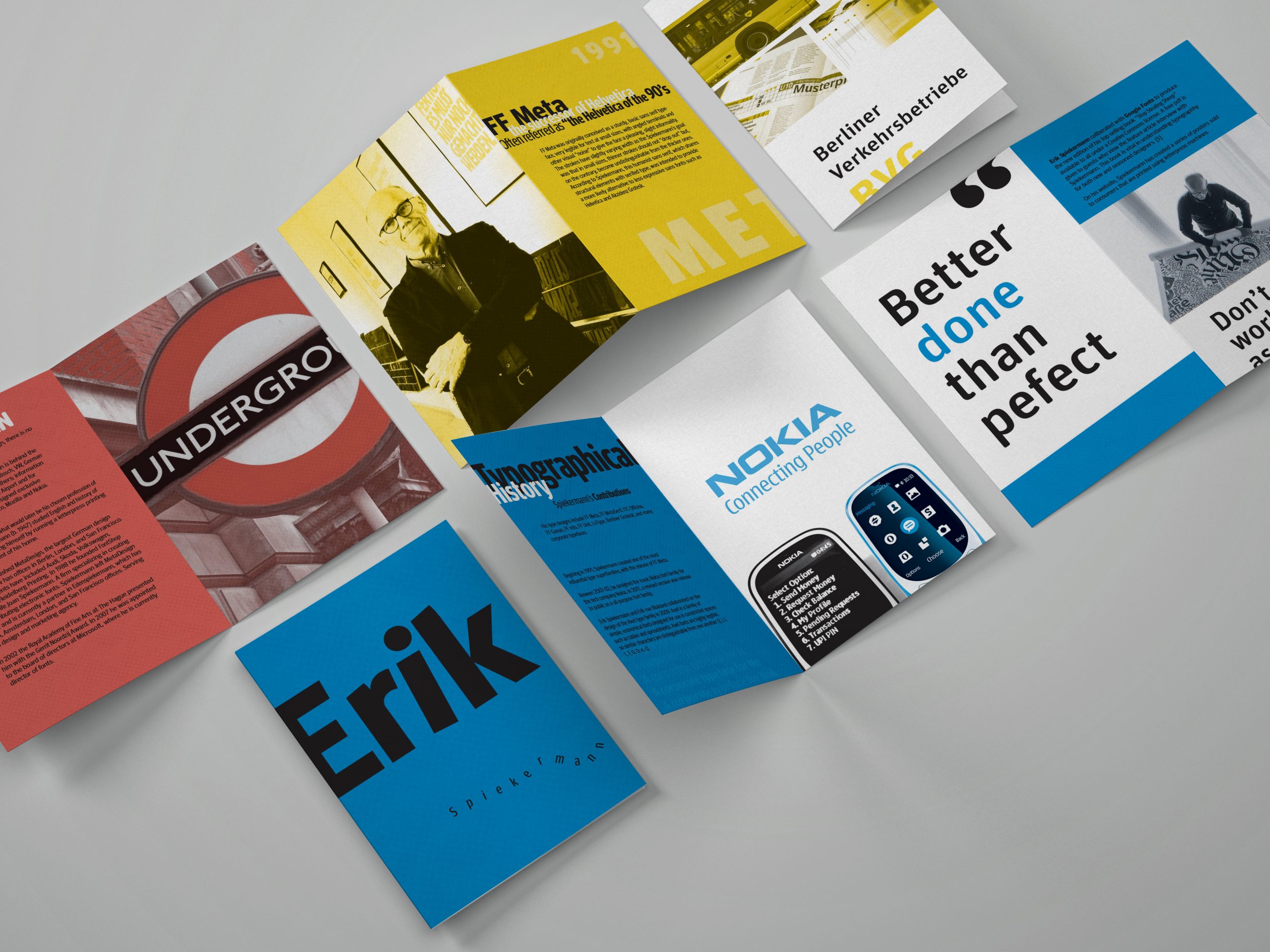This project focuses on the career of renowned type designer, Erik Spiekermann. Each spread highlights a key portion of his life. The booklet was to be printed using a Risograph printer. Therefore color choice was very limited and halftones played a part in filtering out the large color blocks. For each photograph, color separation was made manually and rebuilt in InDesign.