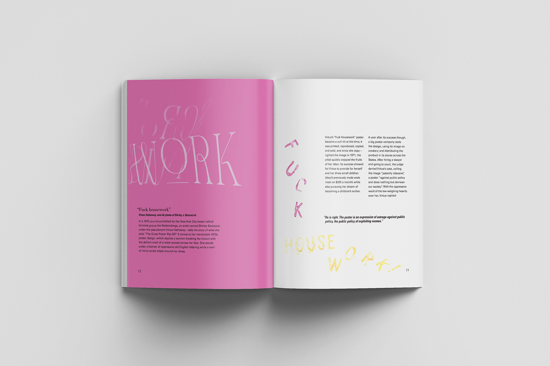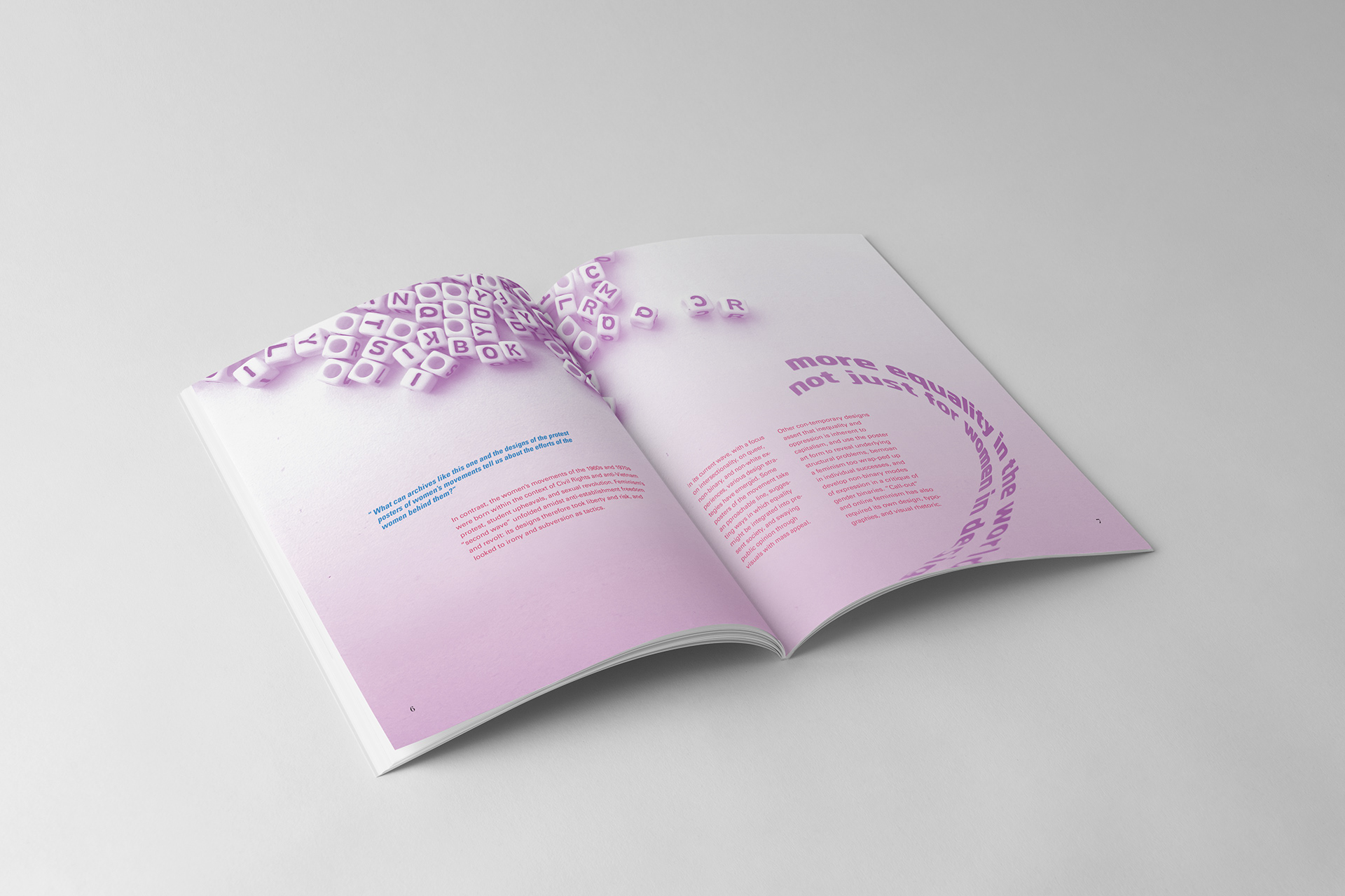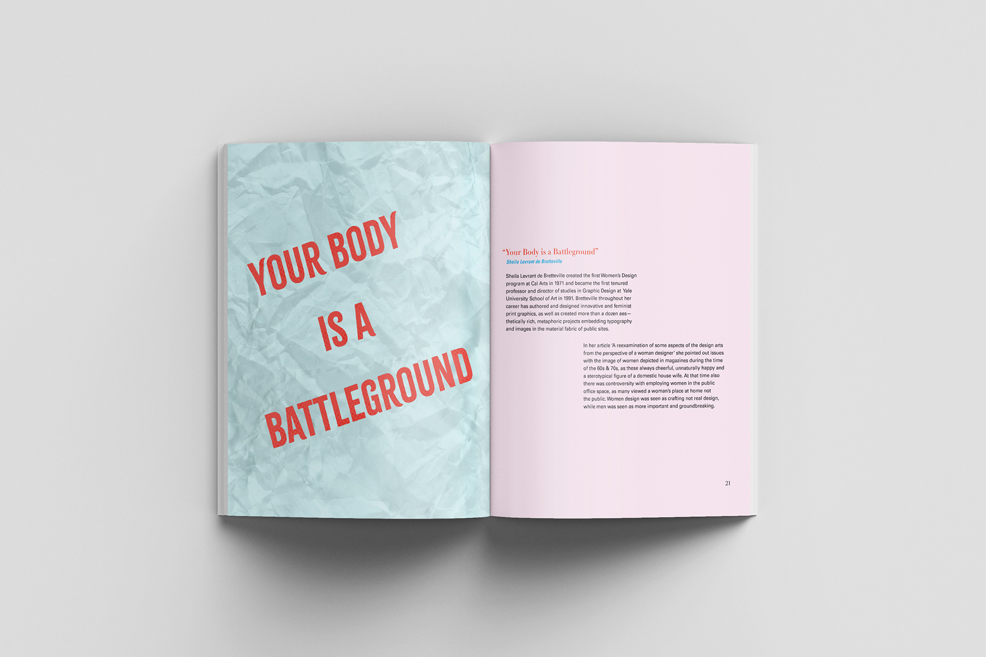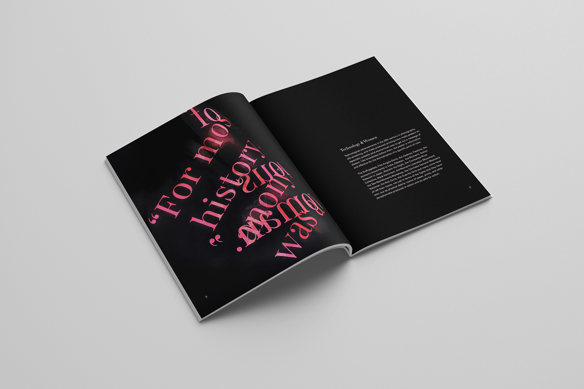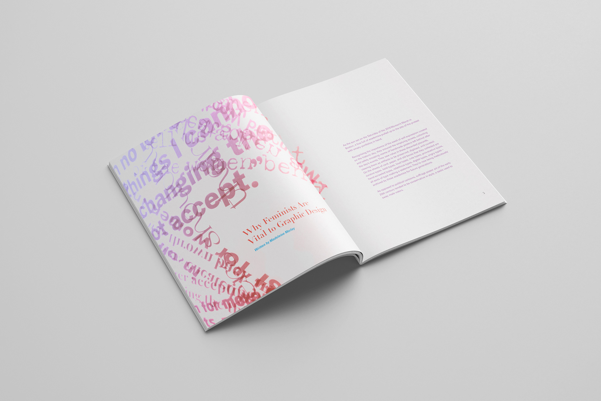 Materiality of Type. A publication expression that combines the writing, collecting, and making, I conducted through the semester. A documentation presentation that showcases my individual working process and explanation of each of my investigations and expressions. For this project, my subject of research was on ‘Women in Design’ that focused on their past, huddles women faced and how Feminists opened gateways to inclusion in the workplace with women. I created analog and digital typography expressions that match the main points of the, and article I laid out in the book.